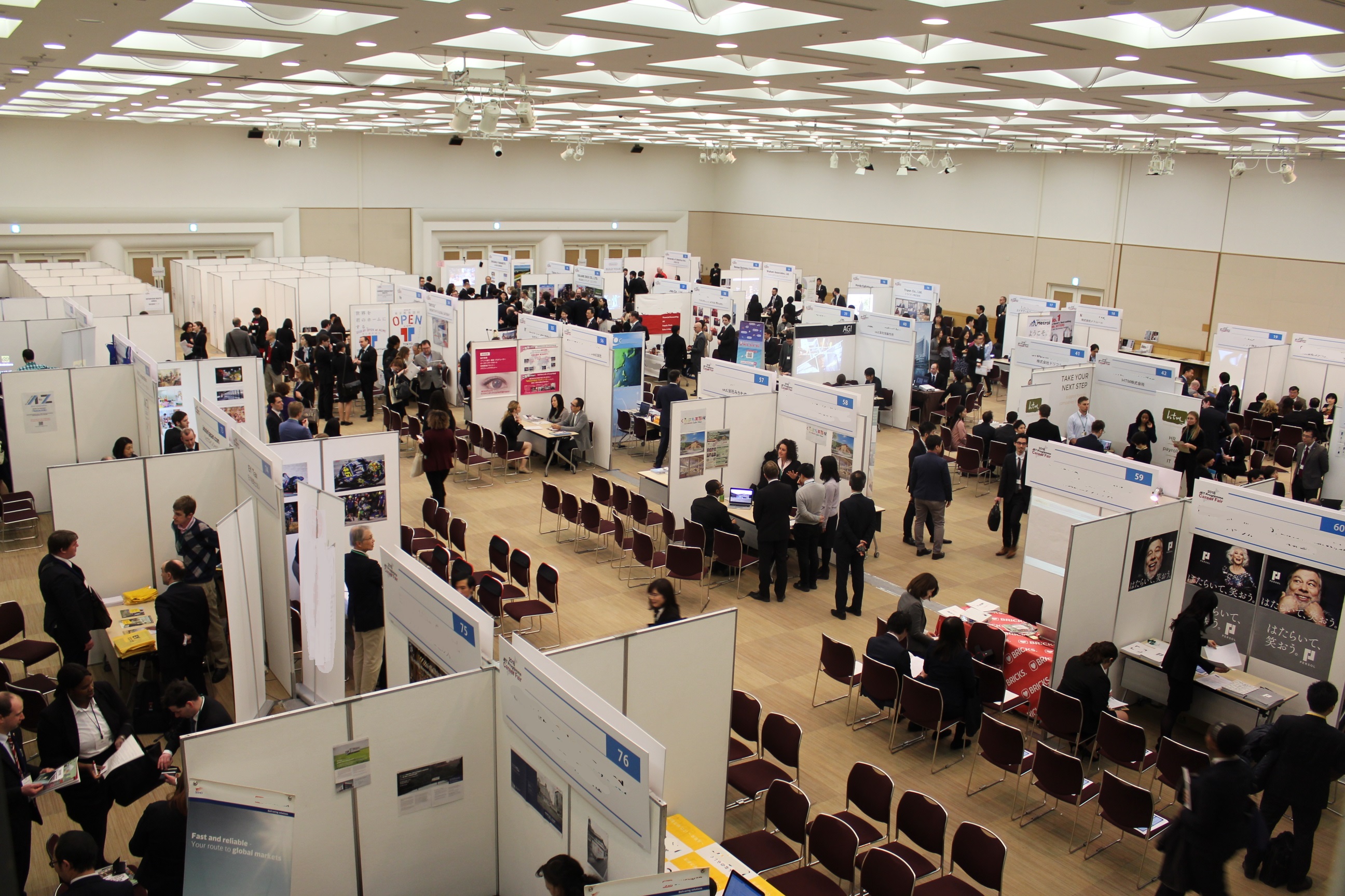 終了前研修が様々な業界におけるキャリアパスについての情報を参加者に提供した一方、グローバル人材を求める企業・団体と国際感覚を身につけた人材であるJET参加者との出会いの場となったJETプログラムキャリアフェア(首都圏)は同会場で2月25日に行われ、幅広い分野で活躍している企業75社にご出展いただきました。本キャリアフェアへの参加者に日本での就職活動に関する知識を身に付けていただき、各出展企業の代表者と出会っていただくことができたと思われます。